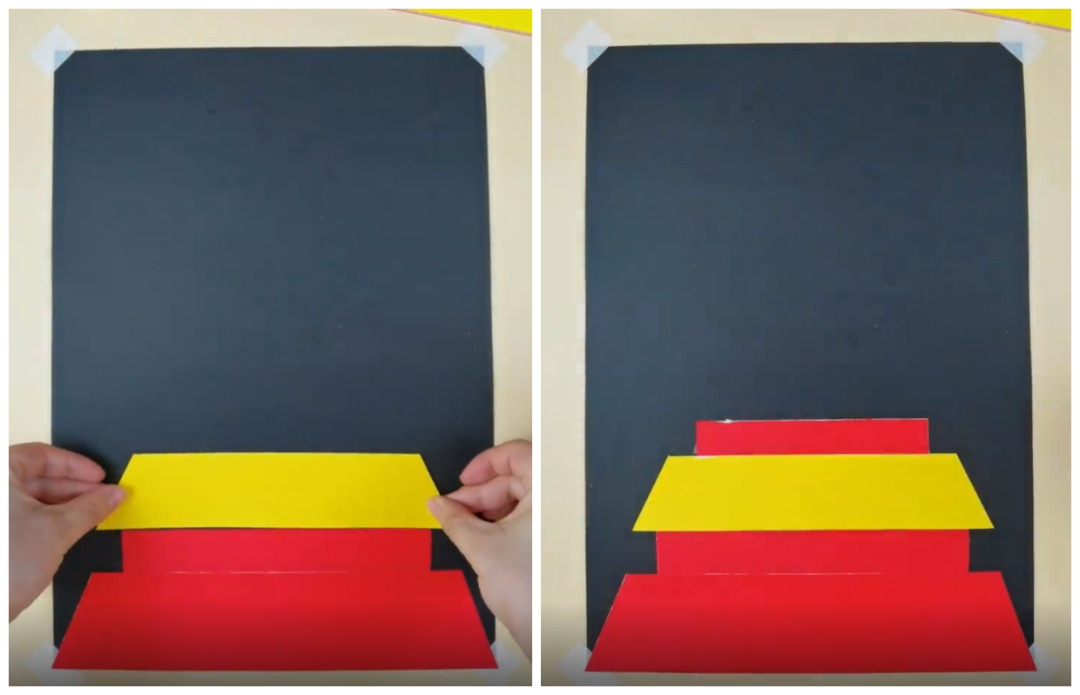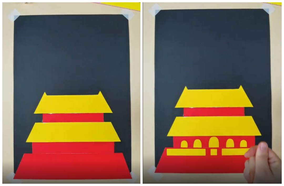 ● The red and yellow cardboard are layered on the bottom of the black background cardboard as shown below to build the prototype of Tiananmen Square: